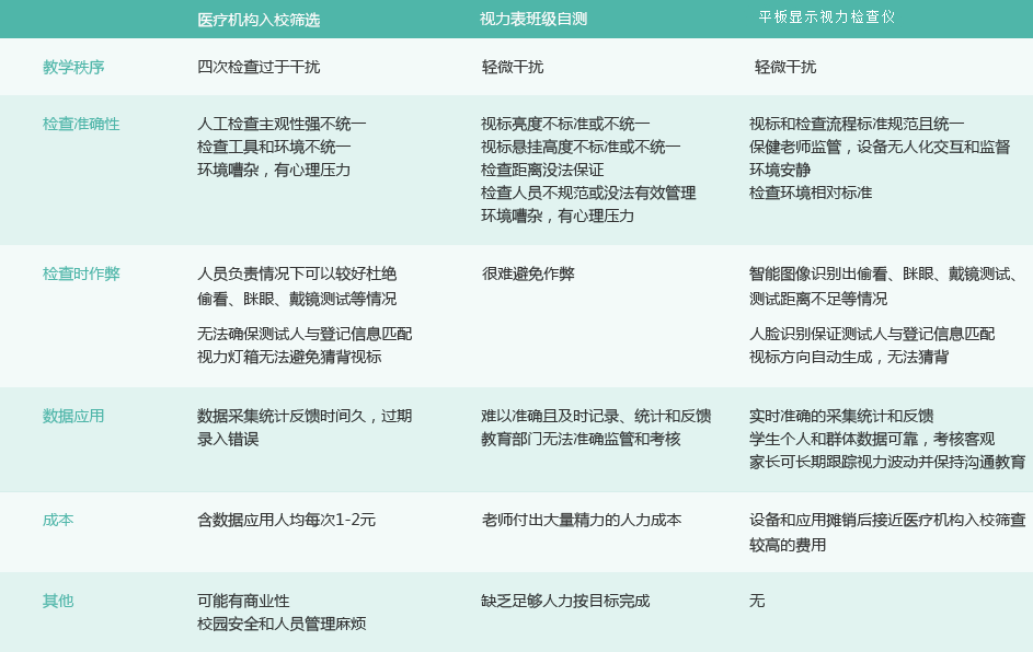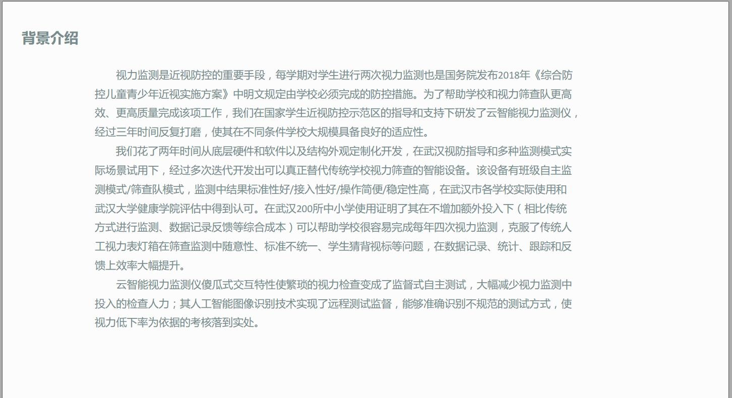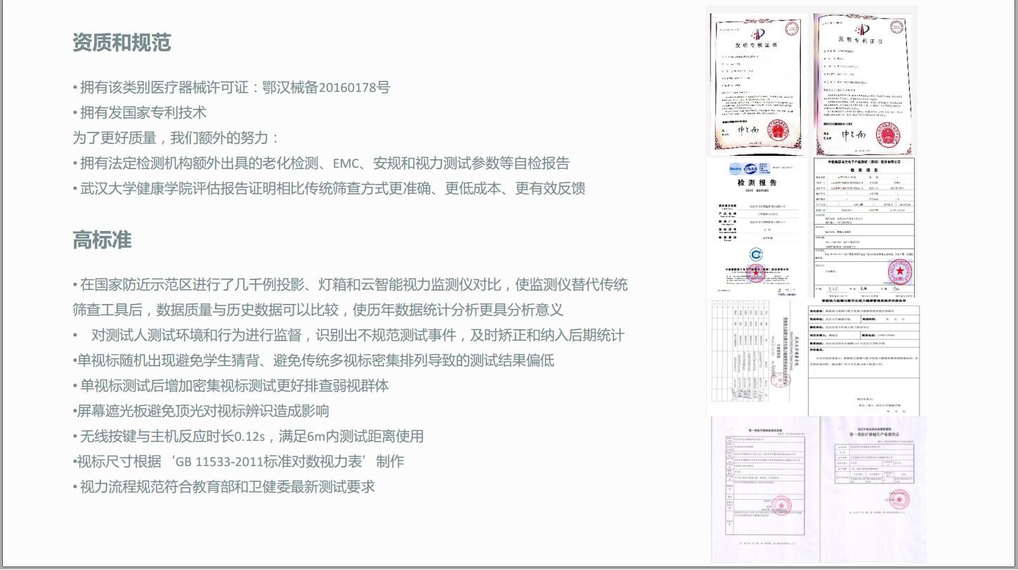 *經(jīng)過(guò)武漢大學(xué)健康學(xué)院評(píng)估,該設(shè)備替代傳統(tǒng)方式可以在不增加額外投入情況下真正完成教 育部規(guī)定的每學(xué)期兩次視力監(jiān)測(cè),且監(jiān)測(cè)質(zhì)量穩(wěn)定,監(jiān)測(cè)與數(shù)據(jù)分析反饋效率大幅提升。